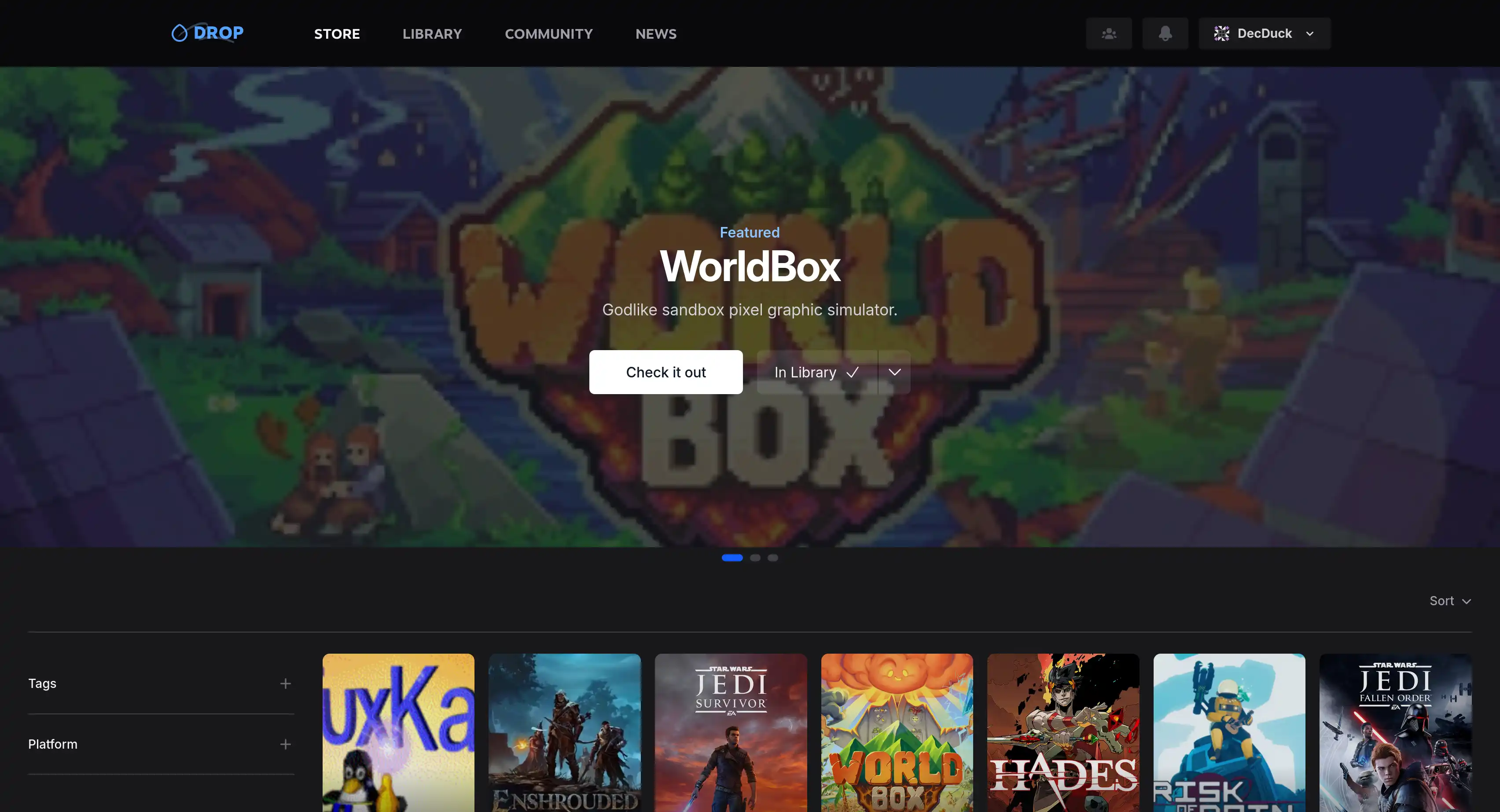 Drop has a fully featured store, where your users can discover and filter your game library, and create collections of their favourite games.
